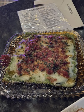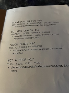 Stargazer have limited reservations and ours were for 7:15PM. By 8PM the place was packed. Small plate apps are $10-16, we had four of them, drinks mostly under $20 we had two recommended by our server. The Mushrum $17 Funky Earthy Umani Old Fashioned which E liked and the Gratuitous Nudity $17 Herbacious and refreshing Almost Famous: Träkál Patagonian Spirit, Yellow Chartreuse, lemon, Cocchi Americano, (It was red with fruit on it) that I had. E & I made a pact to not drink wine at places that don’t normally serve it. And no more wine from a can! When we mentioned wine, our server cringed so mixed drinks would be the order of the night.