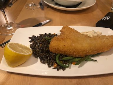 For entrees I ordered pan fried Walleye and E had Rigatoni. My Walleye came with asparagus, a FULL HALF of lemon some of us greatly appreciate and the most incredible Wild Rice we have ever had, god it's good. The fish was great and about double the size of a normal fish fry.